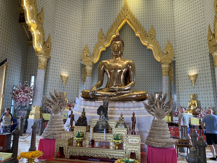 Our next stop was the Wat Traimit temple, home of the Golden Buddha. This 3-meter statue is made of solid gold and weighs 5.5 tons. Opal explained that in the mid-1700s, the statue was covered with cement (stucco, according to Wikipedia) and colored glass to conceal its true value. In 1955, while the statue was being relocated, a portion of the cement chipped off, revealing the gold underneath. According to Guinness World Records, it is the world’s largest solid gold structure and, at current gold prices, the world’s most valuable religious object.