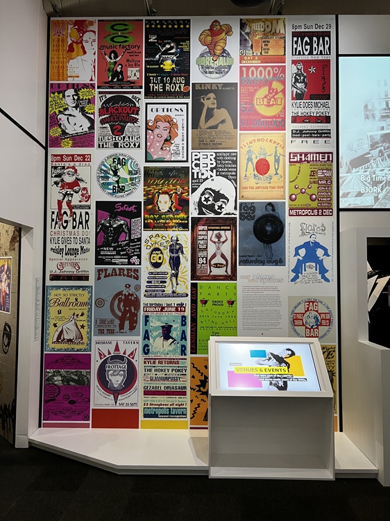 The Queensland Museum was displaying an exhibit called “Make a Scene: Fashioning Queer Identity and Club Culture in the 90s.” We don’t recall styles like this at clubs we visited in the US, but these were some of the outfits created by local designers.