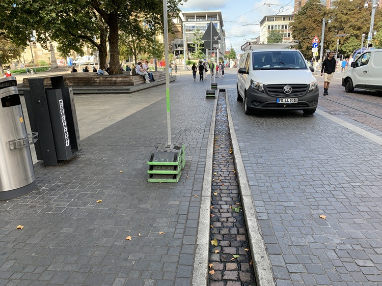 These gutters (called runnels), about a foot wide and several inches deep, can be seen throughout the downtown area. Originally, they were used to carry wastewater out of town. (Aromatic, no doubt.) When the city installed a modern sewer system, it decided to leave the runnels in place as a remnant of the past. Now, they carry fresh water from the Dreisam River – except this one, whose water was temporarily shut off due to a nearby construction project.