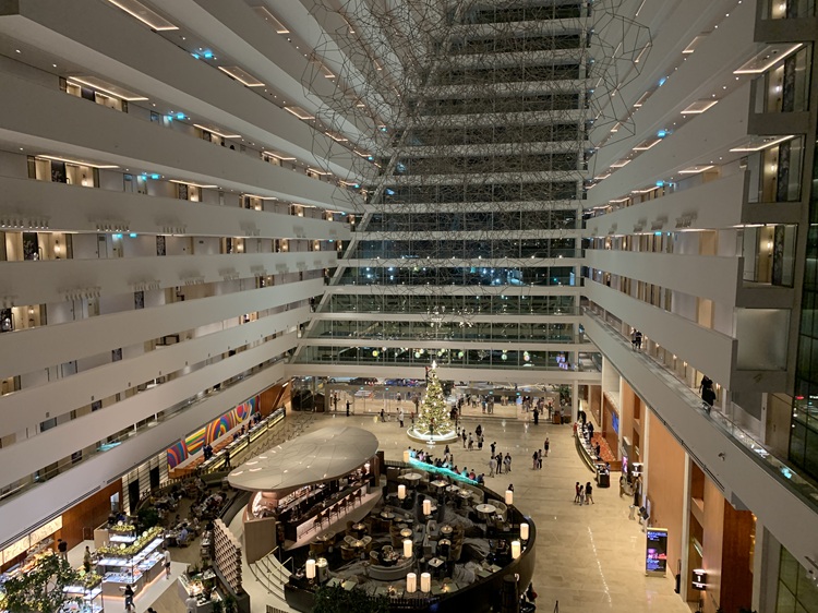 Adjoining the hotel on the harbor side is a 3-story, 800,000 sq ft luxury shopping mall. Note the hanging Christmas trees.