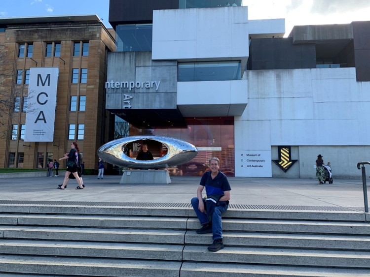 Our flight home left in the evening of our last day in Sydney, so we checked out of our apartment hotel and left our luggage with the front desk. Then we visited the Museum of Contemporary Art, located in a neighborhood called The Rocks near Sydney Harbour, across the wharf from the Opera House. Similar to the Art Museum of New South Wales, above, it consisted of an older building and a newer expansion.